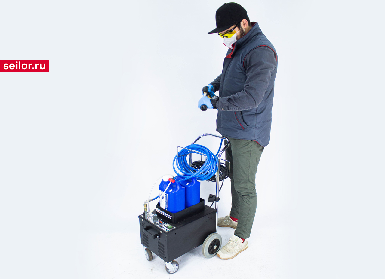 - Визуальный эффект пены: белая пена покрывает все типы поверхности (стены, умывальники, санузлы). Поэтому рабочий может легко проверить, все ли углы покрыты пеной для полного и эффективного воздействия во всех точках.